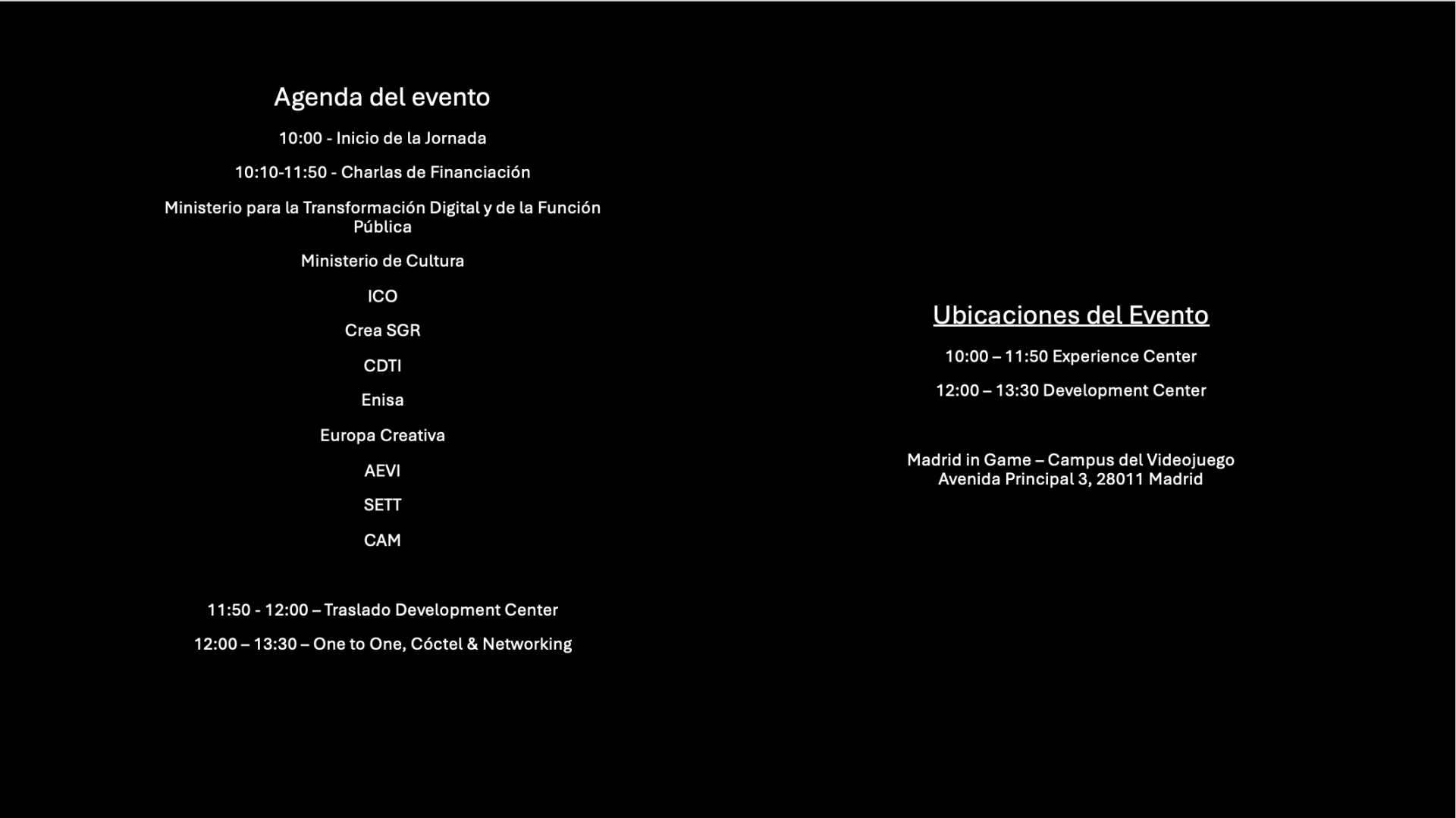 Durante este evento, tendrás la oportunidad de escuchar a representantes de nueve importantes instituciones, todas ellas interesadas en financiar y apoyar proyectos del sector audiovisual y del videojuego. Entre las entidades participantes se encuentran el Ministerio para la Transformación Digital y de la Función Pública, Ministerio de Cultura, ENISA, ICO, CDTI, Crea SGR, Europa Creativa, SETT, AEVI y La Comunidad de Madrid.